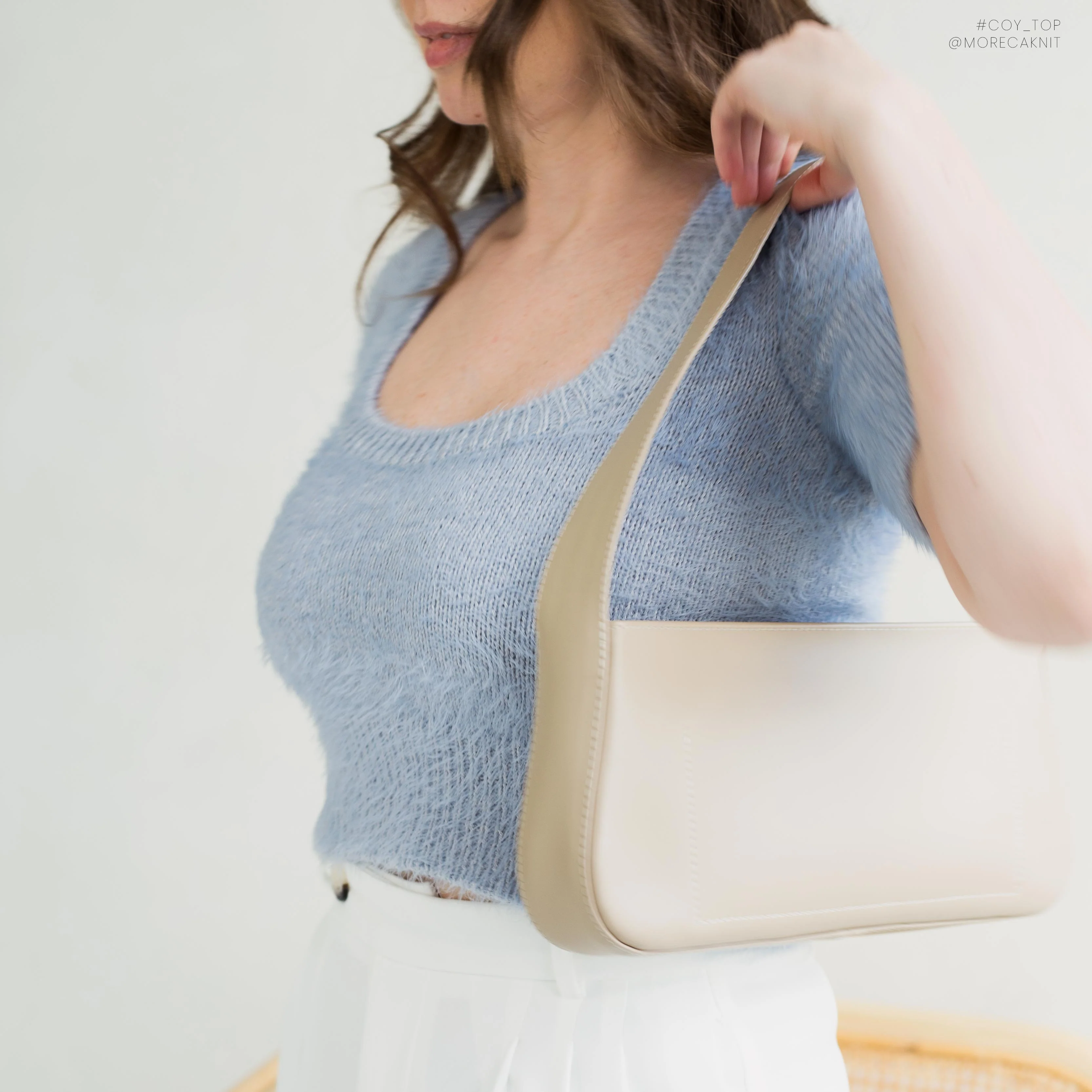 The Coy Top is worked in stockinette stitch. A 1x1 rib is used along the edges for a neat, defined look. Starting with a Provisional Cast-On, the work begins from the mid-body. The deep neckline and shoulders are shaped using the Sloped Bind-Off technique. The sleeves are then worked in the round, with short rows utilized to ensure a perfect fit. Lastly, the stitches are unzipped to continue working the body top-down.